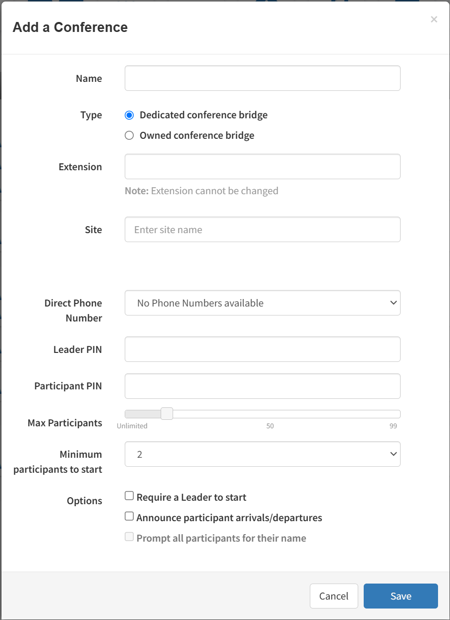 | Extension | Adding a conference: select the extension used to join this conference. Editing a conference: read-only field that shows the extension. |