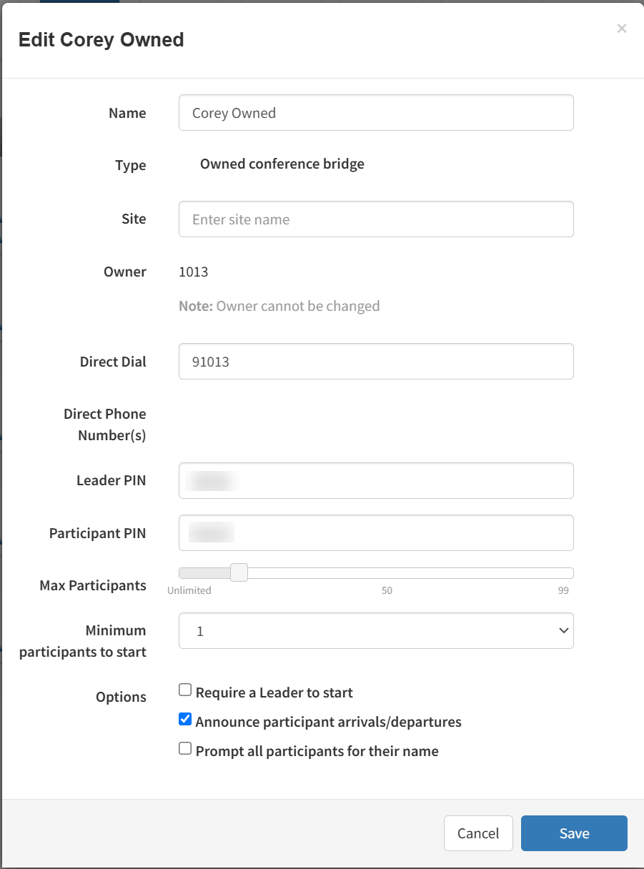| Direct Phone Number | Select the phone number used to join the conference. Owned bridges also have a direct dial field, which is the number internal users can dial to access the bridge. |