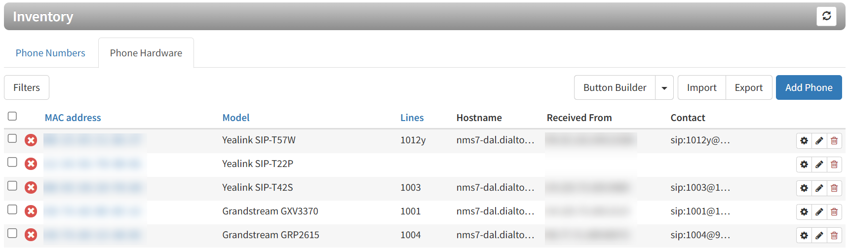 The Phone Hardware tab allows you to filter, add, edit, open Button Builder, importing phones, and export information about the phone hardware in your system.