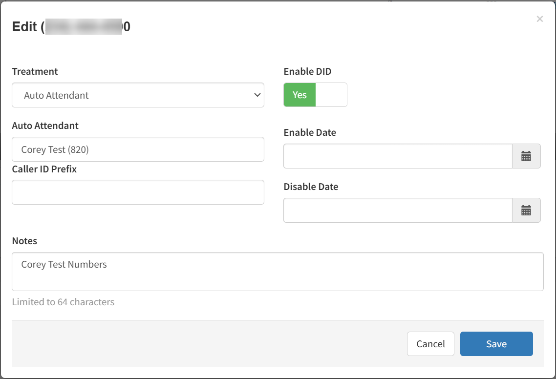 | Enable DID | Toggle switch to Enable (Yes) or Disable (No) the DID. To read more on this see our article Enabling or Disabling a DID. |