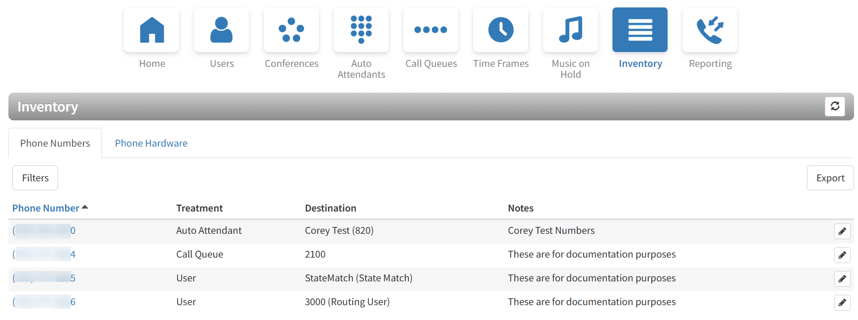 The Inventory page allows you to manage your phone numbers and phone hardware.