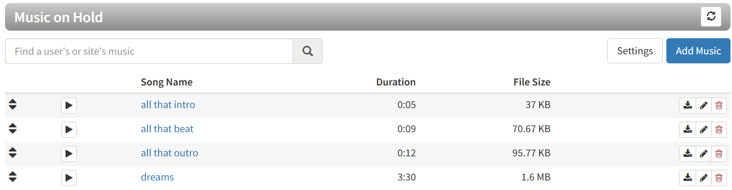 4. After the file is uploaded, you can play it on your computer by clicking the play icon to the left of the file on the Music On Hold page.