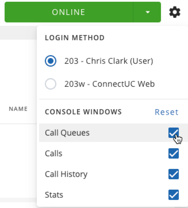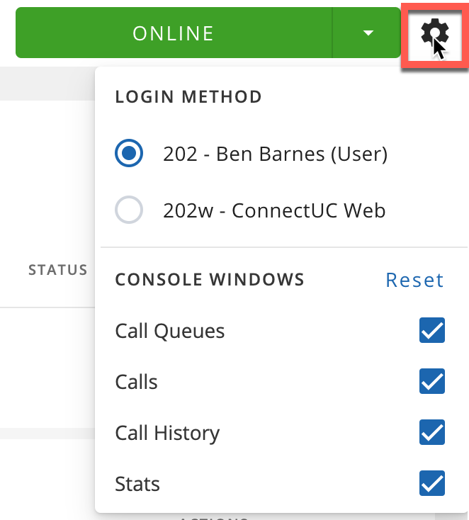 To confirm or change an agent’s login method (for users with multiple extensions), click the settings option found at the top-right corner of the screen. Agents may also manage your Call Center “dashboard” view from these settings to either show or hide elements like Call History and Call Center Agent Stats.