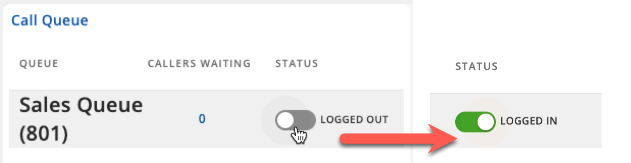 To log in to a Call Queue, simply toggle the “Logged Out” switch under the ‘Status’ section within the ‘Call Queue’ menu.