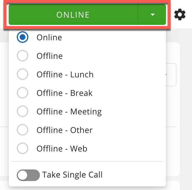 Call Center Agents may change their queue status by clicking the colored status bar found at the top right corner of the screen. Once selected, agents may go online, or they may enter offline status, which includes a variety of “reason codes” such as Lunch, Break, Meeting, Etc.