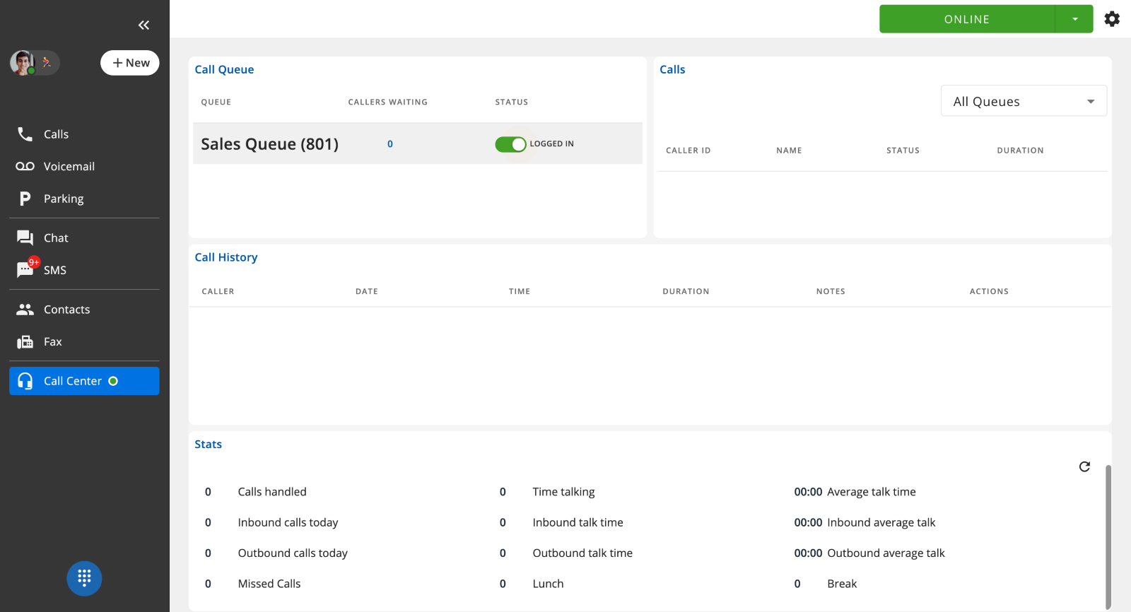 Call Center Agents may view Call Queue and Agent Stats within the Call Center tab.