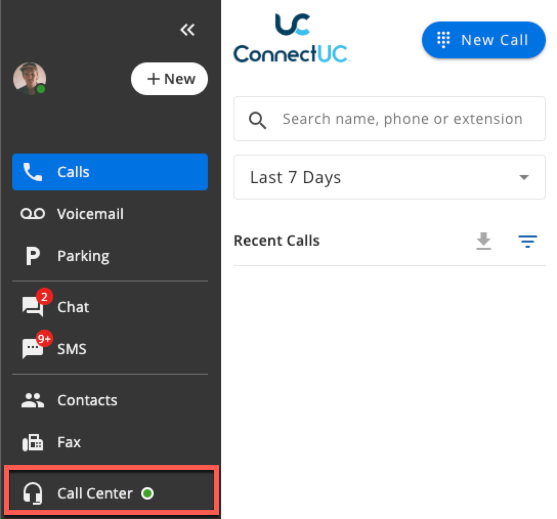 The Call Center tab on the left side menu includes an always-active status indicator whereby ‘green’ indicates the agent is available and logged into a Call Center Queue, and ‘red’ indicates the user is offline (including meetings, breaks, and lunches).