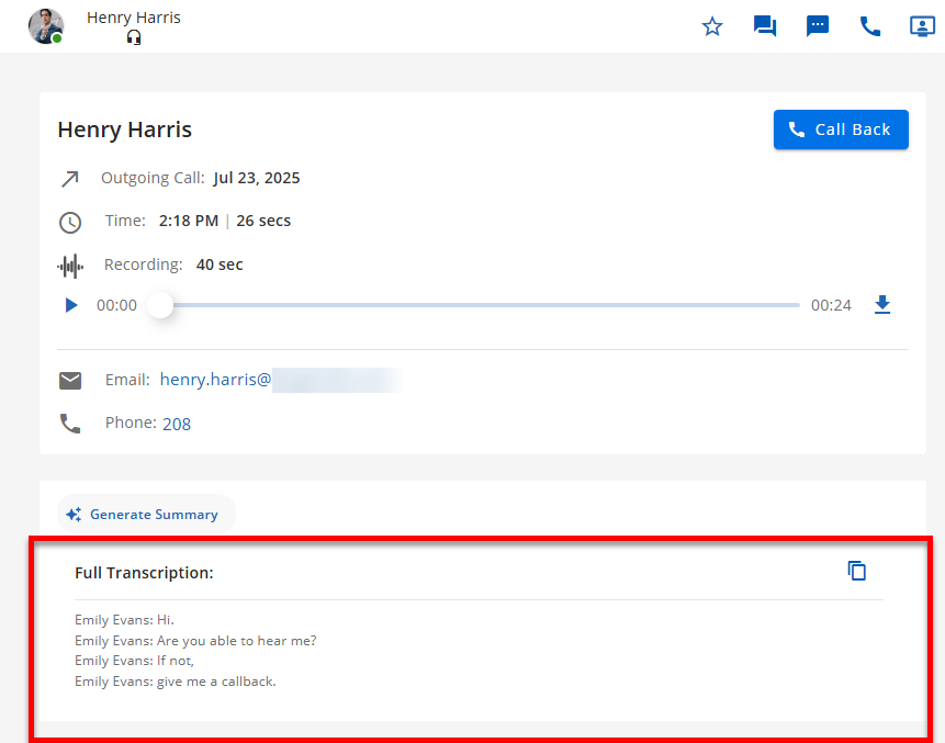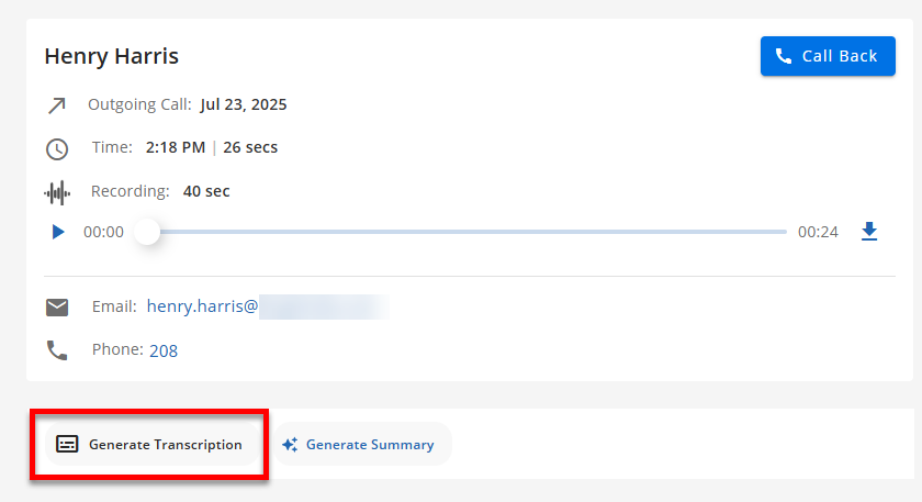 Once selected, you can view the call details screen and at the bottom you can generate a transcription of the call by clicking on the 'Generate Transcription' button, pictured below.