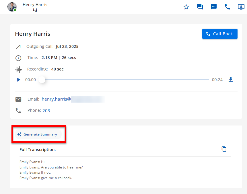 To generate a summary of the recording click on the 'Generate Summary' button found in the bottom area of the Call Details screen.