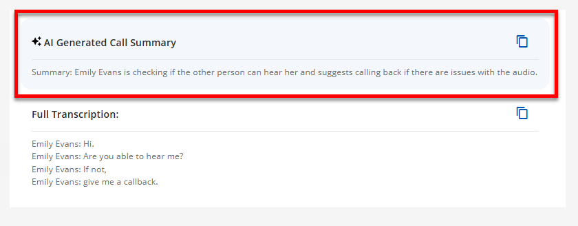 Selecting the 'Generate Transcription' button will show a transcription of the conversation that can be copied by clicking the copy button  found in the upper right area of the transcription text.