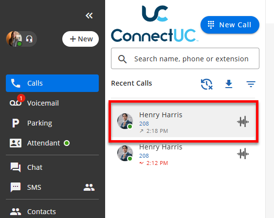 To begin transcribing a call, navigate to the 'Calls' tab and then select a call that includes a recording, which is indicated by the "Audio Wave" icon to the right of the call entry. Click the call entry to view more options.