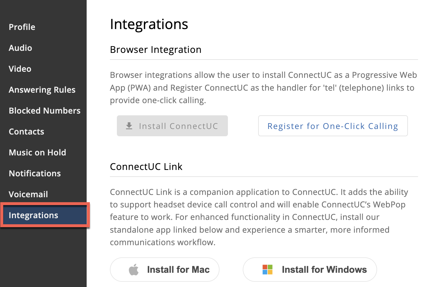 ConnectUC Link is available for download in the MacOS App store and Windows App Store. You can find links for both MacOS and Windows conveniently located under the ‘Integrations’ section of the ConnectUC settings menu.