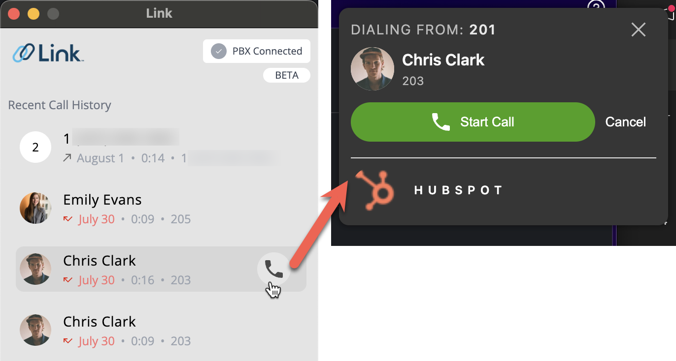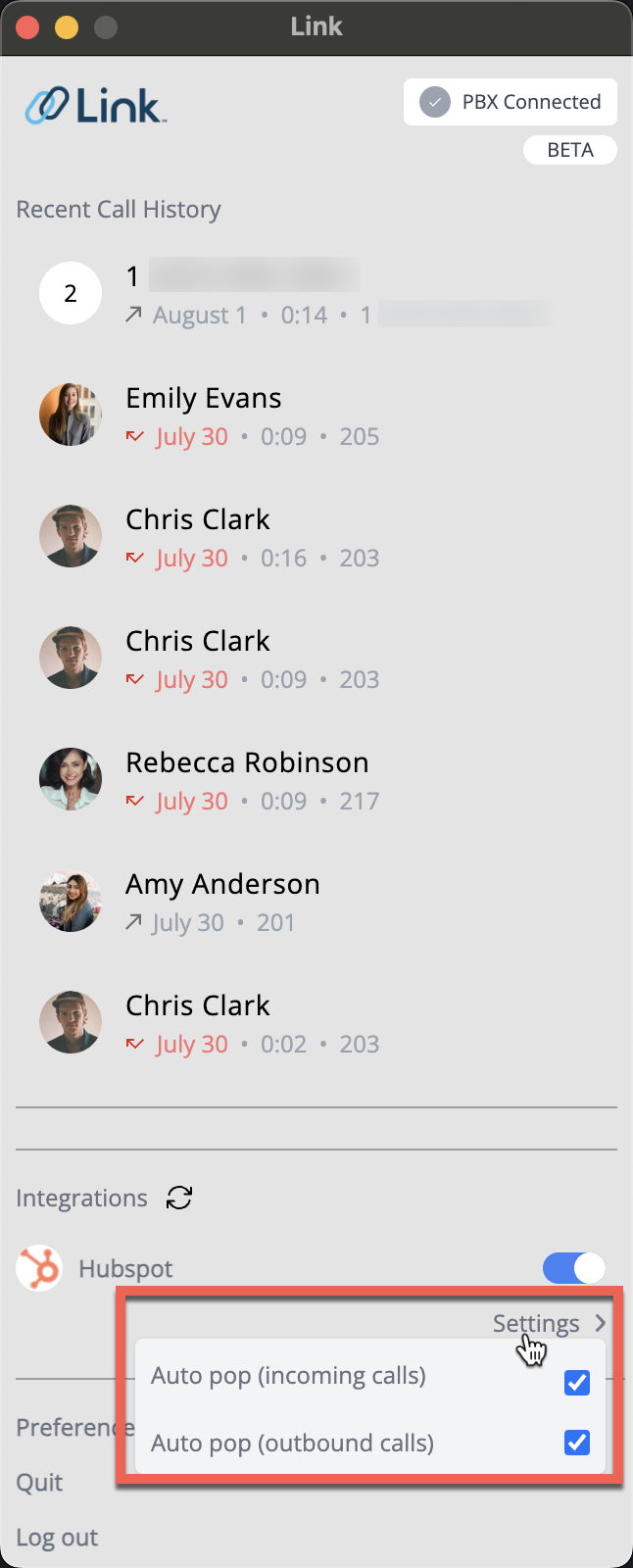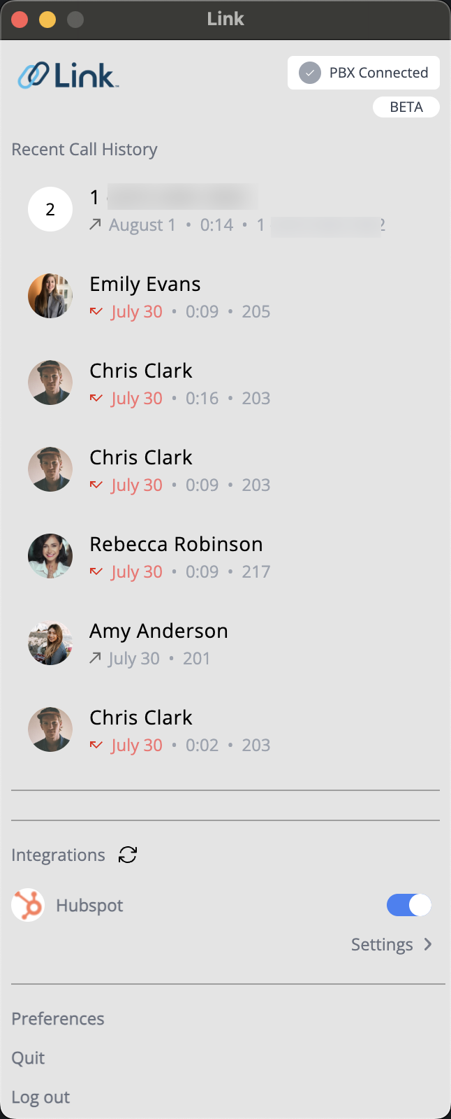 After ConnectUC Link has loaded, you will be able to see recent call history and manage integrations settings for the connected account.