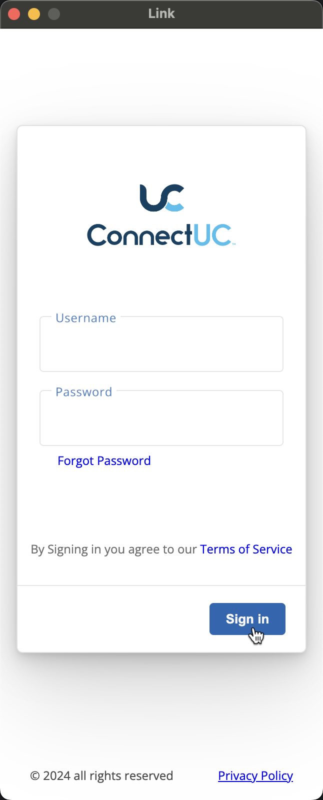 Once installed, when launching the application for the first time, you will be prompted to log in to ConnectUC. Please be sure to use the same username and password used to log in to ConnectUC.