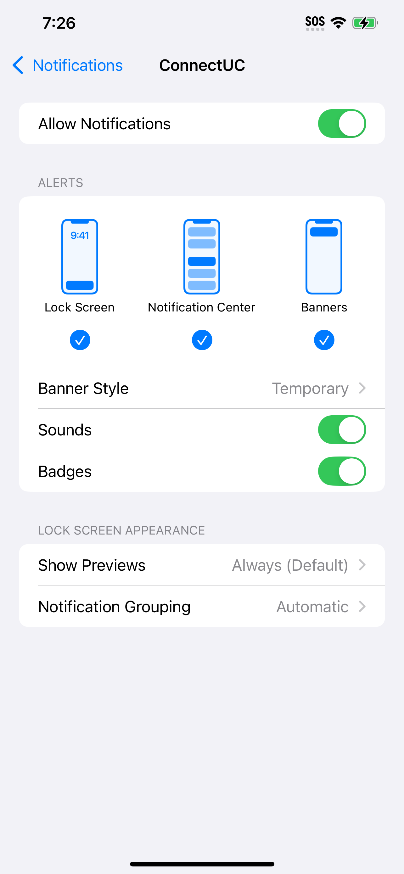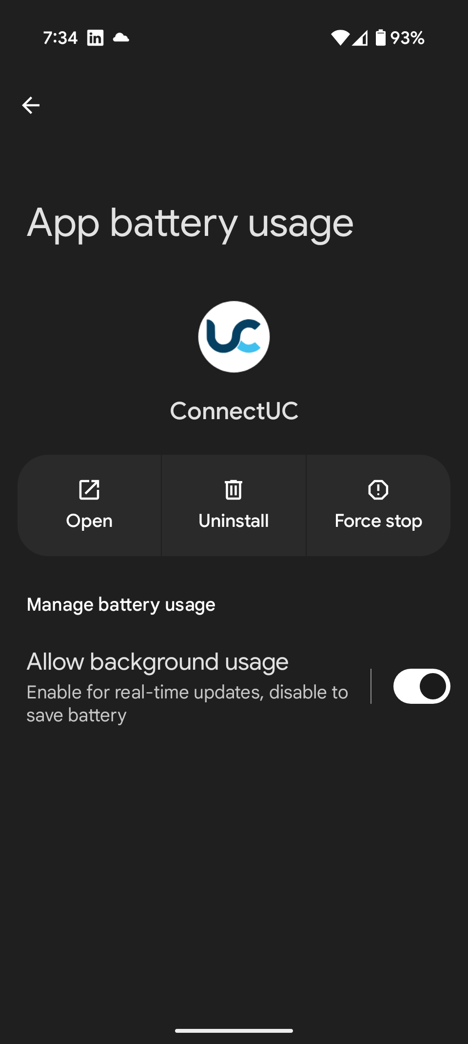 Ensure that ConnectUC App has Bagkground App refresh and Cellular Data enabled: