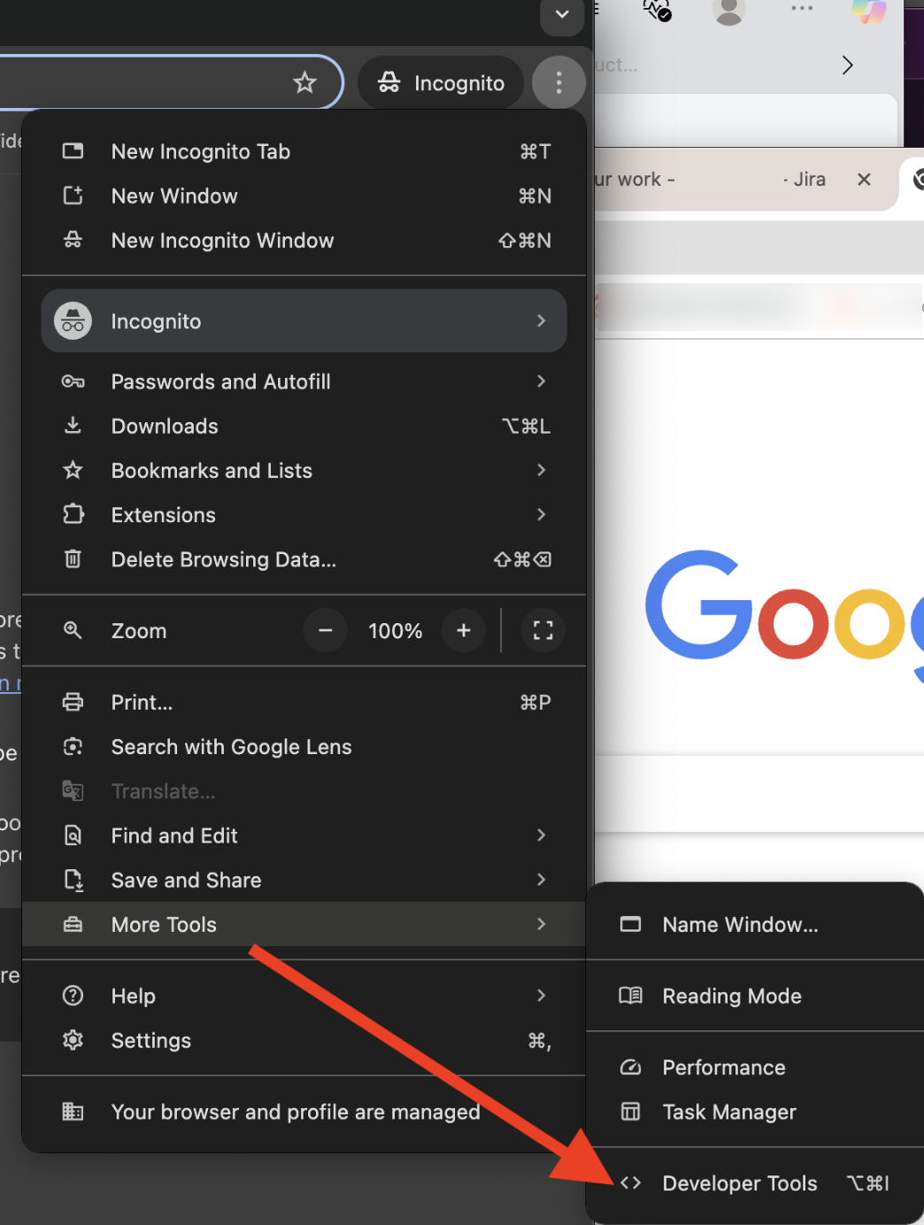 Click on the three button menu (...) in upper right corner and select 'More Tools' and then 'Developer Tools.'