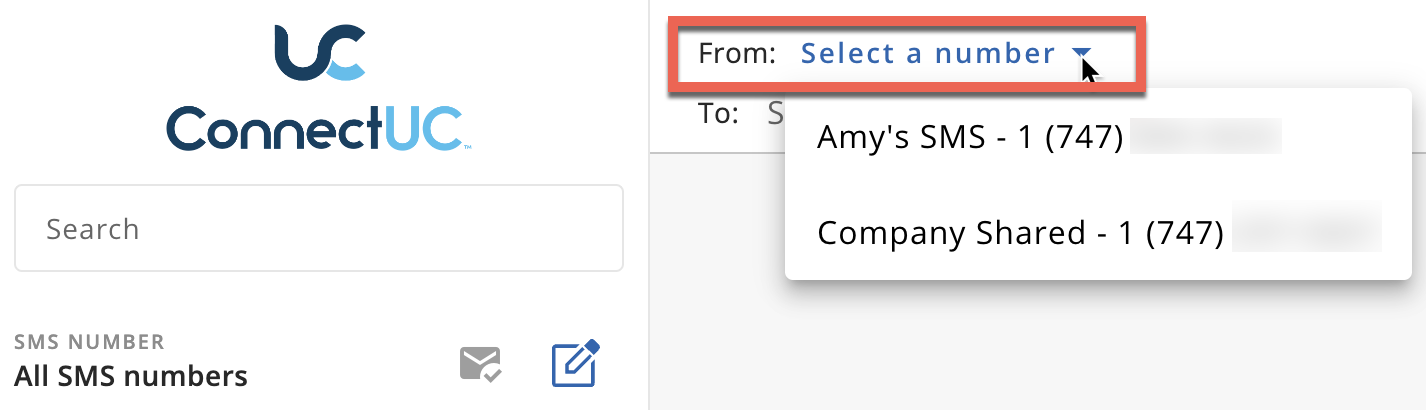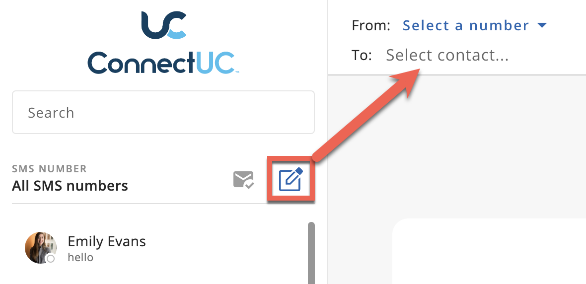 If a user has multiple SMS numbers assigned to them, they can select the outbound SMS number they wish to use by clicking the ‘Select a number’ option when creating a new SMS conversation, as pictured below.