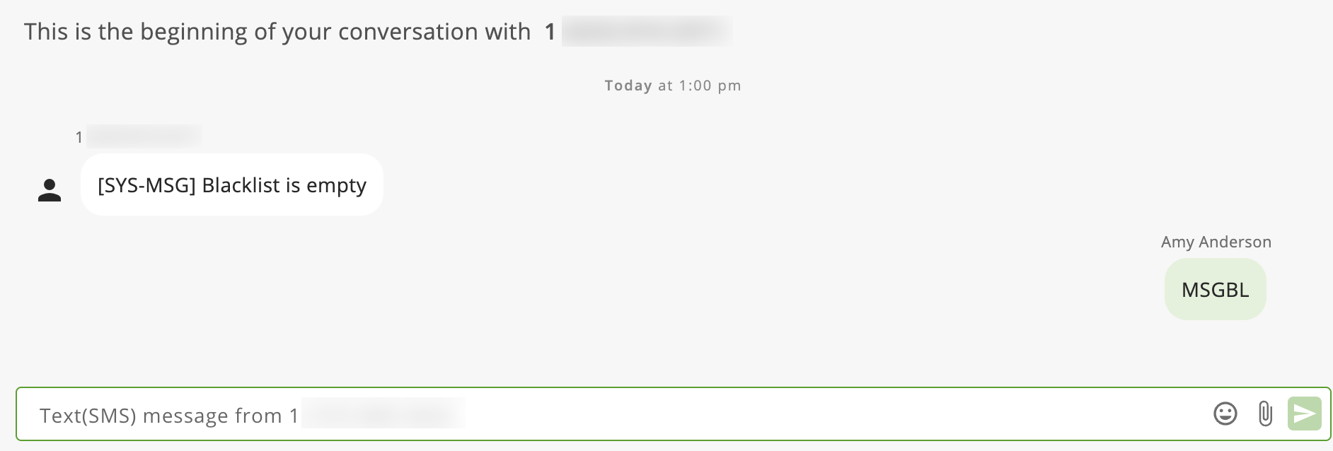 - You may also send 'MSGBL' (Abbreviation for 'Message Black List') to any number, and you will be provided with a list of currently blacklisted numbers, or confirmation that no numbers are currently being blocked, as seen below.