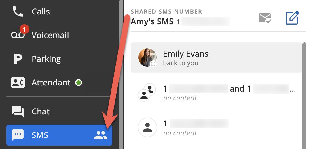 If a user has only one SMS number assigned to them and that number is also shared with other users, a "Shared" icon will be displayed on the left side menu to the right of "SMS."