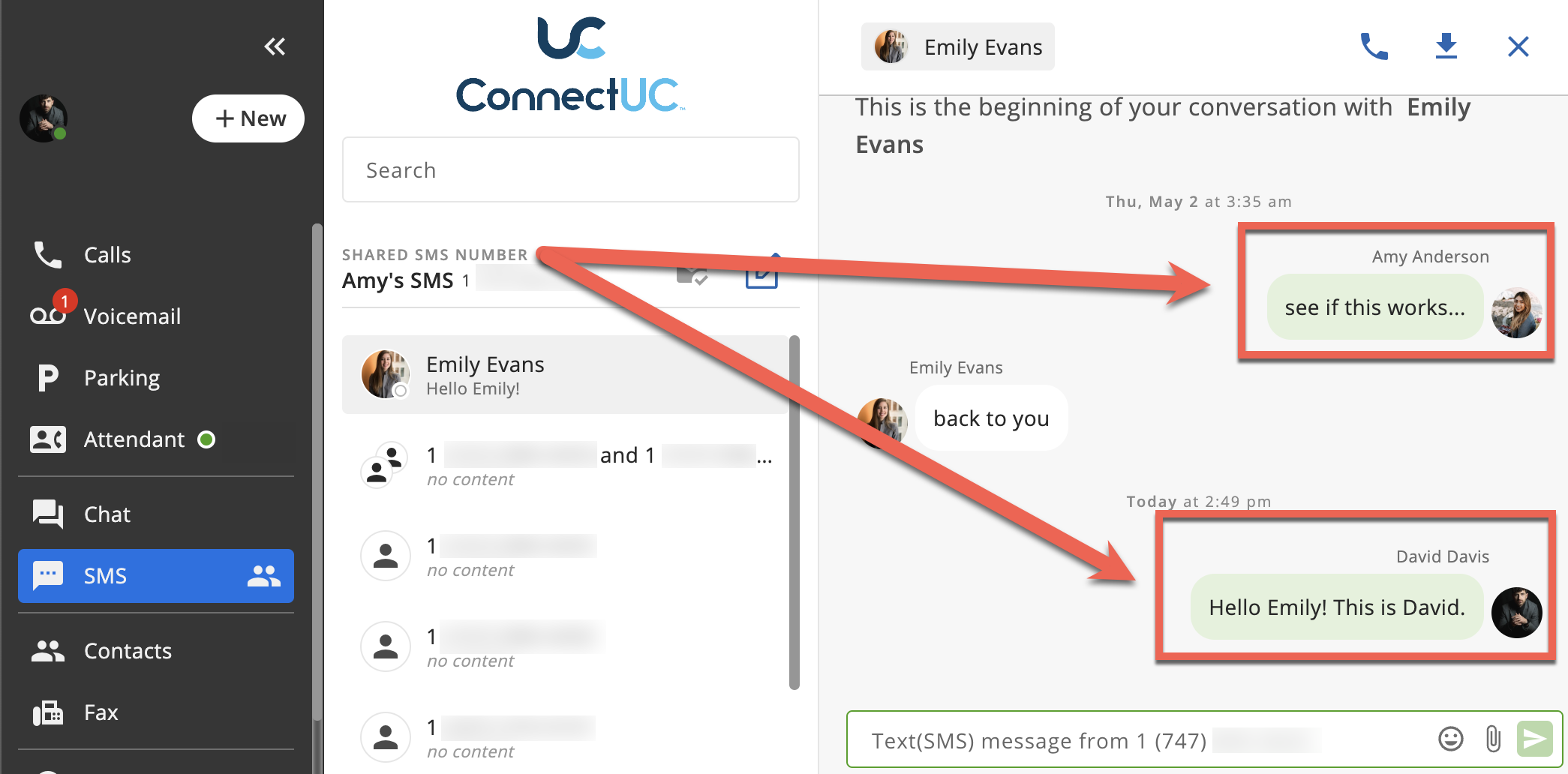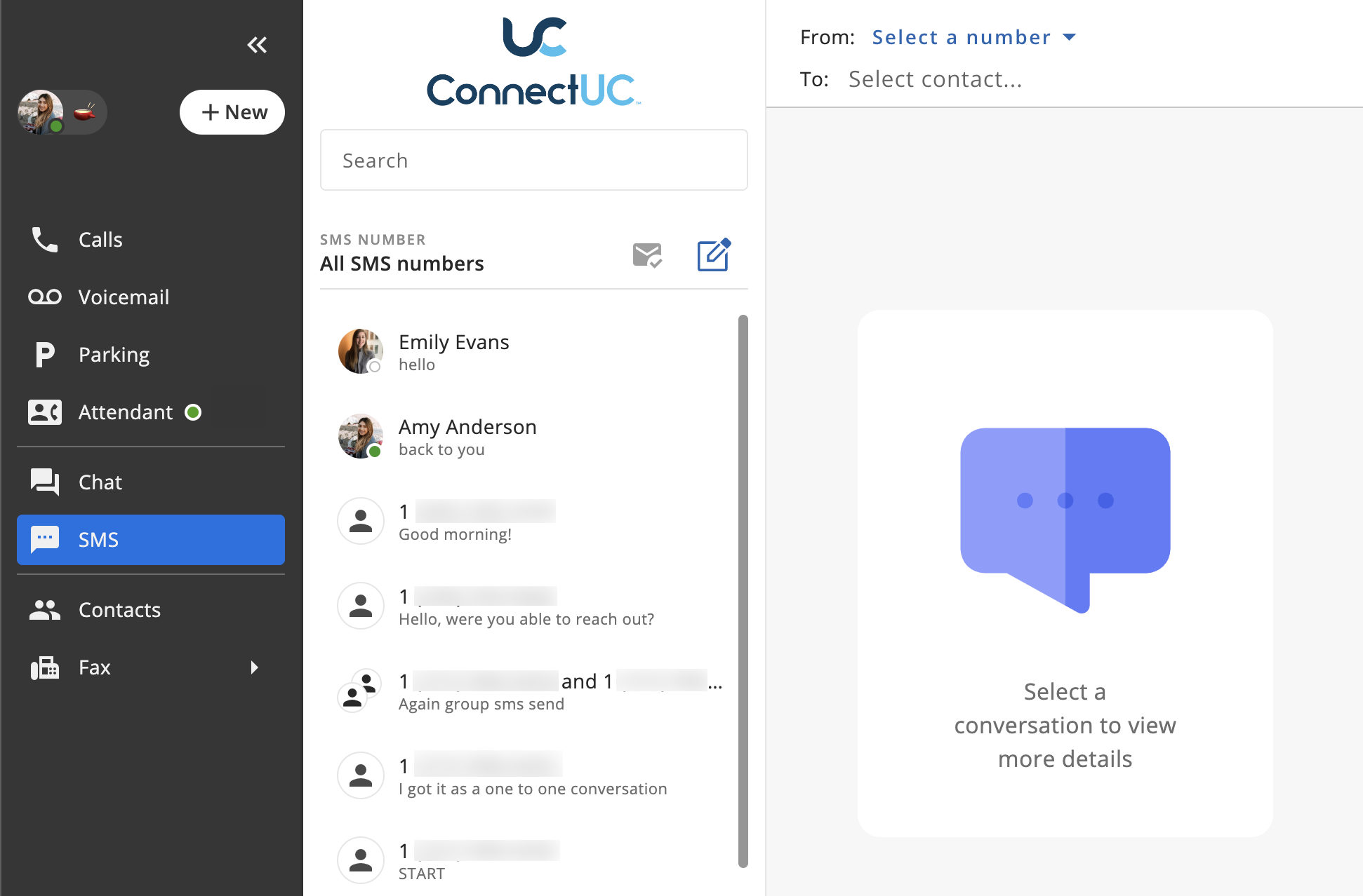 The ConnectUC SMS tab allows you to create, view, and manage SMS conversations.
