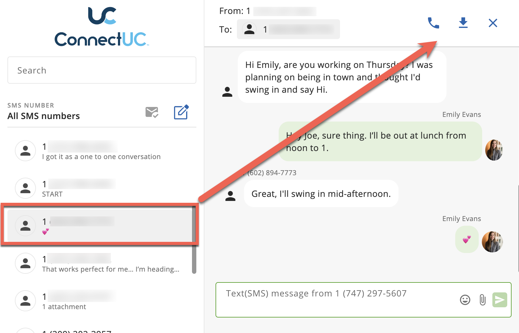 If a user selects an existing SMS conversation from the list on the left-side menu, they can view the message history and reply with new messages. Users may also utilize the icons found at the top right-hand side of the page to call the contact, download the SMS conversation (.txt format) or close the conversation.